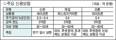 ¡ß ¡®¹æÄ«½´¶û½º¡¯·Î Ãë±Þ ÀºÇà ´Ã¾î=¹æÄ«½´¶û½º ¾÷¹«°¡ °ø½ÄÀûÀ¸·Î Çã¿ëµÇ±â ÀüºÎÅÍ ½ÅÇÑ¡¤Á¦ÀÏ¡¤Á¶ÈïÀºÇà µîÀÌ ½Å¿ëº¸Çè »óǰÀ» ¹Ì¸® ³»³õ¾Ò´Ù. À۳⿡ ½ÅÇÑÀºÇà°ú Ä«µðÇÁ»ý¸íÀÌ Á¦ÈÞÇØ ¼±º¸ÀÎ ¡®¼¼ÀÌÇÁ·Ð¡¯Àº º¸Çè·á´Â µû·Î ³»Áö ¾ÊÀ¸³ª ±Ý¸®°¡ ÀÏ¹Ý ´ëÃâ¿¡ ºñÇØ ¿¬ 0.3¡0.4%Æ÷ÀÎÆ® ´õ ³ô´Ù. Á¦ÀÏÀºÇàÀº ACEÈÀç¿Í Á¦ÈÞÇÑ ¡®ÆÛ½ºÆ®ÁöŰ¹Ì·Ð¡¯À» Á¦°øÇϰí ÀÖ´Ù. ¿ª½Ã º¸Çè·á´Â ¾øÀ¸³ª ±Ý¸®¸¦ ¿¬ 0.4%Æ÷ÀÎÆ® Ãß°¡ ºÎ´ãÇØ¾ß ÇÑ´Ù. Á¶ÈïÀºÇàÀº Áö³´Þ 27ÀÏ ACEÈÀç¿Í ¡®¶óÀÌÇÁ·Ð¡¯À» ¼±º¸¿´´Ù. ¿¬ 0.4%Æ÷ÀÎÆ®ÀÇ ´ëÃâ±Ý¸®°¡ Ãß°¡µÈ´Ù. Á¦ÀÏ¡¤Á¶ÈïÀºÇàÀº »óÇØ·Î ÀÎÇØ 50%°¡ ³Ñ´Â ÈÄÀ¯Àå¾Ö°¡ ÀÖ´Â °æ¿ìµµ º¸Çè±ÝÀ» Áö±ÞÇÑ´Ù.