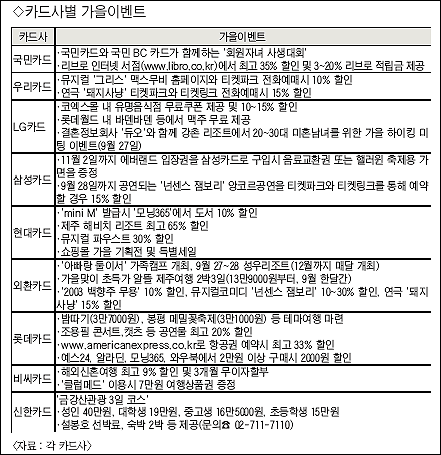 ¡ß µ¶¼¿Í °ø¿¬°ü¶÷ ÇÒÀÎ =µ¶¼ÀÇ °èÀý °¡À»À» ¸Â¾Æ Â÷ºÐÈ÷ Ã¥À» Àаųª ÁÁÀº °ø¿¬À» °ü¶÷ÇÏ´Â °ÍÀÌ ½É½ÅÀÇ ÇǷθ¦ Ǫ´Â µ¥´Â Á¦°ÝÀÌ´Ù. ±¹¹ÎÄ«µå´Â 10¿ù 31ÀϱîÁö ÀÎÅͳݼÁ¡ ¸®ºê·Î(www.libro.co.kr)¿¡¼ ±¹¹ÎÄ«µå·Î °áÁ¦Çϸé Ã¥°ªÀ» ÃÖ°í 35% ÇÒÀÎÇØÁÖ°í, 3~20%¸¦ ¸®ºê·Î Àû¸³±ÝÀ¸·Î Á¦°øÇÑ´Ù. Çà»ç±â°£¿¡ ±¸¸Å°í°´ Áß Ãß÷À» ÅëÇØ »óǰµµ ÁõÁ¤ÇÑ´Ù. ¿ì¸®Ä«µå´Â ¸Æ½º¹«ºñ ȨÆäÀÌÁö¿Í ƼÄÏÆÄÅ© ÀüÈ¿¹¸Å¸¦ ÅëÇØ ¹ÂÁöÄà ¡®±×¸®½º¡¯¸¦ ¿¹¸ÅÇϸé 10% ÇÒÀÎÇýÅÃÀ» ÁØ´Ù. ¶Ç ¿¬±Ø ¡®µÅÁö»ç³É¡¯ ¿¹¸Å ¶§µµ 15% ÇÒÀÎÇØÁØ´Ù. »ï¼ºÄ«µå´Â 28ÀϱîÁö °ø¿¬µÇ´Â ¡®³Í¼¾½º À뺸¸® ¾ÞÄݰø¿¬¡¯À» ƼÄÏÆÄÅ©¿Í ƼÄϸµÅ©¸¦ ÅëÇØ ¿¹¾àÇϸé 15%¸¦ ÇÒÀÎÇØÁØ´Ù. Çö´ëÄ«µå´Â 10¿ù 31ÀϱîÁö ¡®¹Ì´ÏM¡¯Ä«µå¸¦ ¹ß±Þ¹Þ´Â ȸ¿øµé¿¡°Ô ¡®¸ð´×365¡¯¿¡¼ ¹Ì´ÏMÄ«µå·Î °áÁ¦ÇÒ ¶§ Ã¥°ªÀ» 10% ÇÒÀÎÇØÁÖ°í, ¹ÂÁöÄà ¡®ÆÄ¿ì½ºÆ®¡¯ °ü¶÷±ÇÀº 30% ±ð¾ÆÁØ´Ù. ¿Üȯīµå´Â ¡®2003¹éÇâÁÖ ¹«¿ë¡¯ 10% ÇÒÀÎ, ¡®³Í¼¾½º À뺸¸®¡¯ 10~30% ÇÒÀÎ, ¿¬±Ø µÅÁö»ç³É 15% ÇÒÀÎ µîÀÇ ÇýÅÃÀ» ÁØ´Ù. ·Ôµ¥Ä«µå´Â Á¶¿ëÇÊÄܼƮ¿Í ĹÃ÷ µî °ø¿¬¿¡ ´ëÇØ ÃÖ°í 20% ÇÒÀÎÇØÁÖ°í, ¿¹½º24¡¤¾Ë¶óµò¡¤¸ð´×365¡¤¿Í¿ìºÏ¿¡¼ 2¸¸¿ø ÀÌ»ó ±¸¸ÅÇÒ ¶§ 2000¿øÀ» ÇÒÀÎÇØÁØ´Ù. ¾¾Æ¼Ä«µå´Â ¡®¿¹¼úÀÇÀü´ç 2003 û¼Ò³âÀ½¾Çȸ¡¯(27ÀÏ~11¿ù15ÀÏ)¿Í ³Å¸ °ø¿¬ ÀÔÀå·á¸¦ ¾¾Æ¼¸®º¼ºùÄ«µå·Î °áÁ¦ÇÒ ¶§ 5~20%¸¦ ±ð¾ÆÁØ´Ù.