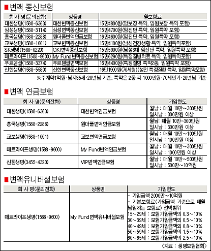 º¯¾×Á¾½Åº¸ÇèÀº ÅõÀÚ½ÇÀû¿¡ µû¶ó »ç¸Áº¸Çè±Ý ¾×¼ö°¡ ´Þ¶óÁø´Ù. Ư¾àÀº ÀÏ¹Ý Á¾½Åº¸Çèó·³ ´Ù¾çÇÏ¸ç ¹è¿ìÀÚ³ª ÀڳຸÀå, ¾Ï µî Áúº´º¸Àå, ¼ö¼úº¸À寝¾à µîÀÌ 10¿©°¡Áö¿¡ À̸¥´Ù. º¸Çè»çº°·Î º¸Àå³»¿ëÀº ºñ½ÁÇϳª ¿¹Á¤ÀÌÀ²(º¸Çè·á¸¦ ¿î¿ëÇØ °è¾à±â°£ µ¿¾È ¾òÀ» ¼ö ÀÖ´Â ¿¹»ó¼öÀÍ·ü)ÀÌ 5~5.5% ¼öÁØÀ¸·Î ¾à°£¾¿ ´Ù¸£±â ¶§¹®¿¡ º¸Çè·á¿¡µµ Â÷À̰¡ ÀÖ´Ù.