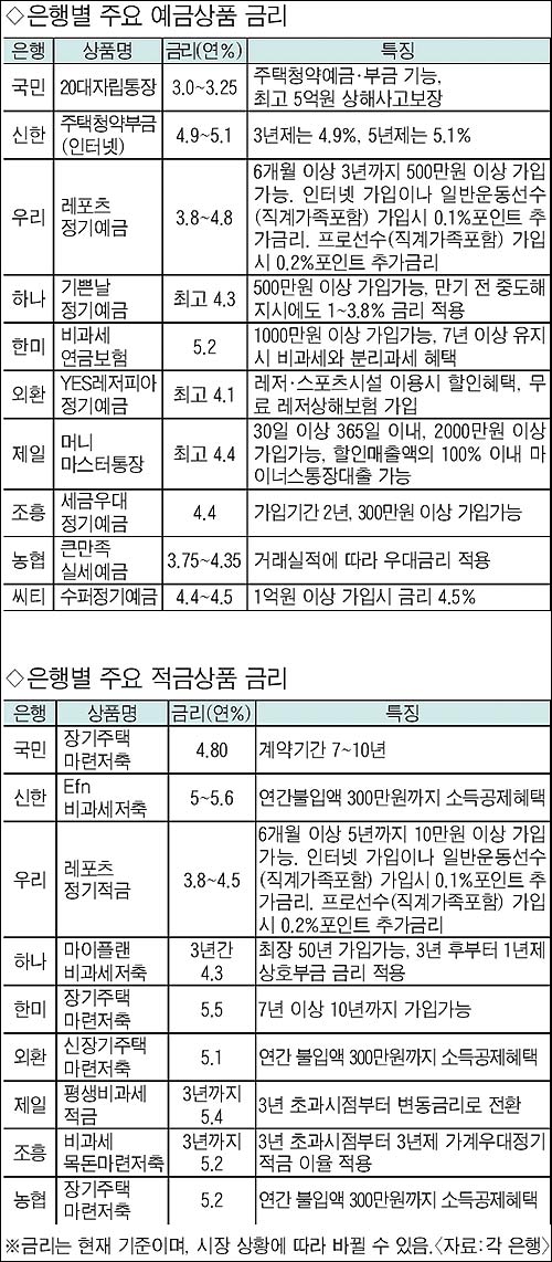 ±Ý¸® 1%Æ÷ÀÎÆ® Â÷ÀÌ¿¡ ¿¬¿¬ÇØÇÏÁö ¾Ê´Â´Ù¸é, ±Ý¸®°¡ ´Ù¼Ò ³·´õ¶óµµ ±Ý¸® ÀÌ¿ÜÀÇ ´Ù¾çÇÑ ºÎ°¡ÇýÅÃÀ» ÁÖ´Â ¿¹±Ý»óǰ¿¡ °ü½ÉÀ» °¡Áú ¸¸ÇÏ´Ù. ¿ì¸®ÀºÇà ·¹Æ÷Ã÷Á¤±â¿¹±ÝÀº ±Ý¸®°¡ 3.8(¸¸±â 6°³¿ù)~4.8%(¸¸±â 3³â)·Î ³ôÀº ÆíÀº ¾Æ´ÏÁö¸¸, 6°³¿ùÀÌ Áö³ª ÁßµµÇØÁöÇÏ´õ¶óµµ ÁßµµÇØÁöÀÌÀÚÀ²ÀÌ ¾Æ´Ñ ÀÏ¹Ý Á¤±â¿¹±ÝÀÇ ±â°£º° ¾àÁ¤ÀÌÀ²À» Áö±ÞÇÑ´Ù. ¶Ç °¢Á¾ ·¹Àú¡¤½ºÆ÷Ã÷½Ã¼³À» ÀÌ¿ëÇϰųª ¿ëǰÀ» ±¸ÀÔÇÒ ¶§ ÃÖ°í 70%ÀÇ ÇÒÀÎÇýÅÃÀ» ÁØ´Ù. ¿ÜȯÀºÇàÀÇ YES·¹ÀúÇǾÆÁ¤±â¿¹±Ýµµ ·¹Àú¡¤½ºÆ÷Ã÷½Ã¼³ ÀÌ¿ë½Ã ÇÒÀÎÇýÅÃÀ» ÁØ´Ù. ±¹¹ÎÀºÇàÀÇ ¡®20´ë ÀÚ¸³ÅëÀ塯Àº ±Ý¸®°¡ 3.0~3.25%·Î ³·Áö¸¸, °¡ÀÔ ÈÄ 2³âÀÌ °æ°úÇϸé ÁÖÅÃû¾à 1¼øÀ§ÀÚ°ÝÀ» ¹ÞÀ» ¼ö ÀÖ°í, ÃÖ°í 5¾ï¿øÀÇ »óÇØ»ç°í¸¦ º¸ÀåÇØÁØ´Ù. Á¦ÀÏÀºÇà ¸Ó´Ï¸¶½ºÅÍ ÅëÀåÀº °èÁ´ç 2000¸¸¿ø ÀÌ»óÀ̸é 30ÀÏ ÀÌ»ó ÇÏ·ç ´ÜÀ§·Î °¡ÀÔÇÒ ¼ö ÀÖ°í, ±ÞÀüÀÌ ÇÊ¿äÇÑ °í°´À» À§ÇØ ÅëÀå Àܾ×À» ´ãº¸·Î ¸¶À̳ʽº ´ëÃâµµ ½Ç½ÃÇÑ´Ù. ÇϳªÀºÇàÀÇ ±â»Û³¯ Á¤±â¿¹±ÝÀº ¸¸±â°¡ 1³âÀÌÁö¸¸, Áßµµ¿¡ ÇØÁöÇÏ´õ¶óµµ 1~3.8%ÀÇ ÀÌÀÚ¸¦ Áö±ÞÇÑ´Ù. ³óÇù Å«¸¸Á·½Ç¼¼¿¹±ÝÀº ±âº»±Ý¸®´Â 3.75%Áö¸¸, Çϳª·Î°¡Á·Àº 4.25%±îÁö ±Ý¸®¸¦ ¿ì´ëÇØÁÖ°í, °Å·¡½ÇÀû°ú ÀÎÅͳݹðÅ· °èÁ ¿¬°á µî¿¡ µû¶ó ÃÖ°í 4.35%ÀÇ ±Ý¸®¸¦ º¸ÀåÇÑ´Ù. Á¶ÈïÀºÇà ¼¼±Ý¿ì´ëÁ¤±â¿¹±ÝÀº Ç¥¸é±Ý¸®´Â ¿¬ 4.4%Áö¸¸, ÀÌÀڼҵ漼(16.5%)¸¦ 6%Æ÷ÀÎÆ® °¨¸éÇØÁØ´Ù.