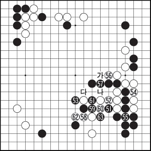 °í½É ³¡¿¡ 52·Î ÀÕÀÚ 53ÀÇ Á¥ÈûÀÌ ÁؾöÇÏ´Ù. ÀÌÁ¦¿Í¼ 54, 55ÀÇ ±³È¯Àº Èæ¿¡°Ô Çϳªµµ ¾ÆÇÁÁö ¾Ê´Ù. Ȳ¸Á Áß¿¡µµ 56Àº ¼ÛŰïÀÇ ¼ø¹ß·ÂÀ» º¸¿©ÁØ ÇÑ ¼ö. ÈæÀÌ »ý°¢¾øÀÌ ¡®°¡¡¯¿¡ ¹ÞÀ¸¸é ¹é ¡®³ª¡¯, Èæ 57 ¶§ ¹é ¡®´Ù¡¯ÀÇ ½Ö¸³À¸·Î Å»ÃâÇÑ´Ù. 58Àº Âü°í 3µµ(6 ÀÌÈÄ A, B°¡ ¸Âº¸±â)¸¦ ÇÇÇÏ´Â ÃÖ¼±ÀÇ º¯½Å. 63±îÁö ¹Ù²ãÃļ± ÈæÀÇ ¸¸Á·ÀÌ´Ù.