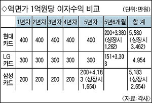 ¿¹ÄÁ´ë ¾×¸é°¡ 1¸¸¿øÂ¥¸® Çö´ëÄ«µå ÈļøÀ§ CB´Â Áö³ ÁÖ Ã¤±Ç½ÃÀå¿¡¼ 9090¿øÀ¸·Î °Å·¡¸¦ ¸¶°¨Çß´Ù. Çö´ëÄ«µå CB´Â ¸¸±â(5³â6°³¿ù)±îÁö º¸À¯ÇÒ °æ¿ì, ¾×¸é°¡¸¦ ±âÁØÀ¸·Î ¸Å³â 9%ÀÇ ÀÌÀÚ°¡ Áö±ÞµÈ´Ù. ¾×¸é°¡ 1¸¸¿ø´ç ¸Å³â 900¿øÀÇ ÀÌÀÚ¸¦ ¹ÞÀ» ¼ö ÀÖ´Â °ÍÀÌ´Ù. µû¶ó¼ 1¸¸¿øÂ¥¸®¸¦ 9000¿ø¿¡ »ç°Ô µÇ¸é, ¿ø±Ý 9000¿ø¿¡ ¸Å³â 900¿øÀÇ ÀÌÀÚ¸¦ ¹Þ°Ô µÇ¹Ç·Î ¼öÀÍ·üÀÌ 10%°¡ µÈ´Ù.