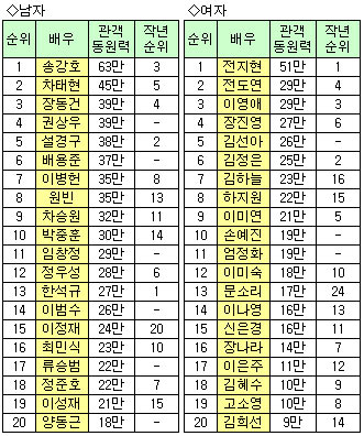Ãæ¹«·Î Á¦ÀÛÀÚµéÀÌ Æò°¡ÇÑ ³²³à ¹è¿ì °ü°´µ¿¿ø·Â 1À§´Â ¼Û°È£(63¸¸¸í¡¤ÀÌÇÏ Àü±¹ °ü°´¼ö)¿Í ÀüÁöÇö(51¸¸)À̾ú´Ù. µÎ »ç¶÷Àº ´Ù¸¥ ¹è¿ìµéÀ» Å« Â÷ÀÌ·Î µûµ¹¸®°í È®°íºÎµ¿ÇÑ 1À§¸¦ ±â·ÏÇß´Ù. ³²ÀÚ¹è¿ìÀÇ °æ¿ì Â÷ÅÂÇö¡¤À嵿°Ç¡¤±Ç»ó¿ì¡¤¼³°æ±¸°¡ Â÷·Ê·Î 2À§ºÎÅÍ 5À§±îÁö Â÷ÁöÇß´Ù. ¿©¹è¿ì´Â Àüµµ¿¬¡¤ÀÌ¿µ¾Ö¡¤ÀåÁø¿µ¡¤±è¼±¾Æ°¡ ¼ø¼´ë·Î 2À§ºÎÅÍ 5À§±îÁö¿´´Ù.