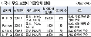 ÀüÀÚÁ¦Ç° À¯Åë°ú ºñ±³ÇÏ¸é º¸Çèȸ»çÀÇ Àü¼Ó ¼³°è»ç´Â Àü¹®´ë¸®Á¡¿¡, µ¶¸³ ´ë¸®Á¡Àº ¾çÆÇÁ¡¿¡ °¢°¢ ºñÀ¯ÇÒ ¼ö ÀÖ´Ù. Áö³ 2001³âºÎÅÍ ¼Ó¼Ó ¼³¸³µÇ±â ½ÃÀÛÇÑ µ¶¸³´ë¸®Á¡Àº ¿©·¯ º¸Çèȸ»çÀÇ »óǰÀ» ºñ±³ÇØ °¡Àå À¯¸®ÇÑ »óǰ¿¡ °¡ÀÔÇÒ ¼ö ÀÖ´Ù´Â ÀåÁ¡ÀÌ ºÎ°¢µÇ¸é¼ °ý¸ñÇÒ ¸¸ÇÑ ¼ºÀå¼¼¸¦ º¸À̰í ÀÖ´Ù. ±¹³» 1È£ µ¶¸³´ë¸®Á¡ÀÎ KFG´Â ¼³¸³ 2³â ¸¸¿¡ ¿ù 2¾ï5000¸¸¿øÀÇ º¸Çè°è¾à ½ÇÀûÀ» ±â·Ï, À¢¸¸ÇÑ Áß¼ÒÇü »ýº¸»ç ¼öÁØÀ» ³Ñ¾î¼¹´Ù<Ç¥ ÂüÁ¶>.