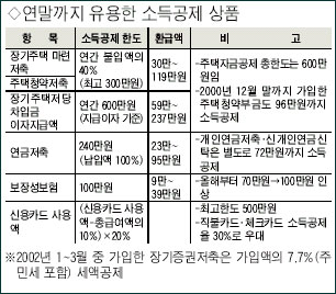 2000³â 12¿ù¸»±îÁö °¡ÀÔÇÑ ÁÖÅÃû¾àºÎ±Ýµµ 2005³â ¸»±îÁö´Â ¿¬°£ ºÒÀÔ¾×ÀÇ 40%(ÃÖ°í 96¸¸¿ø)±îÁö ¼Òµæ°øÁ¦¸¦ ¹ÞÀ» ¼ö ÀÖÀ¸¸ç, 2002³â 3¿ù ¸»±îÁö °¡ÀÔÇÑ Àå±âÁõ±ÇÀúÃàÀº ¿ÃÇØ ¸»±îÁö ¼¼¾×°øÁ¦(°¡ÀԱݾ×ÀÇ 7.7%)¸¦ ¹ÞÀ» ¼ö ÀÖ´Ù.