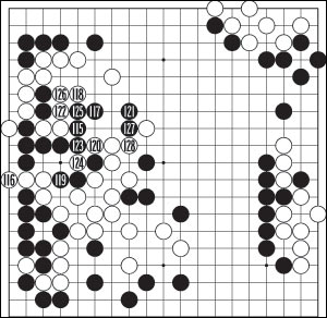 115ÀÇ ´Ü¼ö¿¡ âÇÏ¿À´Â Àå°í(7ºÐ) ³¡¿¡ 116À¸·Î Â÷´ÜÇÏ°í ³ª¼±´Ù. ¿ª½Ã ±×³É ³Ñ°ÜÁ༱ ½Ì°Ì´Ù°í ÆÇ´ÜÇÑ ¸ð¾çÀÌ´Ù. 117 ¶§ ¹éÀÌ Âü°íµµ 1, 3À¸·Î Æ÷À§ÇØ ÀâÀ¸·¯ ³ª¼´Â °ÍÀº ÈæÀÌ 4, 6À» ¼±¼ö ÈÄ A·Î ¶§·Á³»¼ »ê´Ù. ±×·¡¼ 118·Î Èæ µÎÁ¡À» ÀâÀ¸¸ç ¹ÛÀ¸·Î ÂѾƳÂÀ¸³ª 127±îÁö ÈÎÈÎ Å»ÃâÇß´Ù. ÀÌ·¡¼± 116À¸·Î ±×³É 122¿¡ µÐ °Í¸¸µµ ¸øÇÑ °á°ú´Ù.