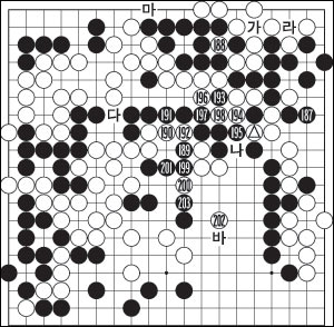 <Á¦13º¸>(187~203)=¹é ´Â ÆÖ°¨. ÈæÀÌ ¡®°¡¡¯·Î ¶§¸®¸é ¹é ¡®³ª¡¯·Î Áº¯ÀÇ °Å´ëÇÑ Èæ ´ë¸¶°¡ °í¸³µÈ´Ù. ´Ü¼øÇÑ ¿¬°á ´ë½Å 187·Î ºüÁø ¼ö°¡ ÅëÄèÇÑ ÀÀ¼ö. ±×·¡µµ ¹é ¡®³ª¡¯¸é Âü°í 1µµ ó·³ ¸ÕÀú ÀâÈù´Ù. ±×·¯³ª 189´Â À§Çè õ¸¸ÇÑ ¼ö¿´´Ù. ÆÖ°¨À¸·Î ½èÁö¸¸ 192±îÁö ¼±¼ö·Î ²÷¾î¿À´Ï ³°¨ÇØÁø °Í. 189´Â ¡®´Ù¡¯·Î Áº¯À» ¿¬°á ÈÄ ¹é ¡®¶ó¡¯, Èæ ¡®¸¶¡¯·Î ¼·Î »ì°í ¹éÀÌ Áß¾ÓÀ» ¼ö½ÀÇÒ ¶§ ¼±¼ö »Ì´Â °Ô ÃÖ¼±À̾ú´Ù.