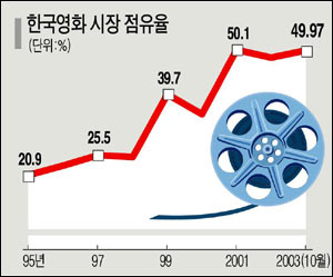 ¿¬°£ Çѱ¹¿µÈ Á¡À¯À²Àº 1995³â¿£ 20.9%¿¡ ¸Ó¹°·¶À¸³ª 1997³â 25.5%·Î ¿Ã¶ú´Ù. ¡®½¬¸®¡¯°¡ ´ë¹ÚÀ» ÅͶ߸° 1999³â 39.7%·Î ±Þ¹°»ìÀ» Ÿ´Ù°¡ ¡®Ä£±¸¡¯ ¡®Á¶Æø¸¶´©¶ó¡¯°¡ ÈïÇàÇÑ 2001³â¿£ 50.1%·Î ÃÖ°í±â·ÏÀ» ¼¼¿ü°í, 2002³â 48.3%·Î ÁÖÃãÇß¾ú´Ù. ¿µÁøÀ§¿¡ µû¸£¸é ¹Ì±¹(95%), Àεµ(97%) µîÀ» Á¦¿ÜÇϰí ÀÚ±¹ ¿µÈ Á¡À¯À²ÀÌ 50%¸¦ ³Ñ±ä ³ª¶ó´Â Çѱ¹ÀÌ °ÅÀÇ À¯ÀÏÇϸç, ÇÁ¶û½º¿Í ÀϺ»µµ 30% ¾ÈÆÆ¿¡ ¸Ó¹°·¯ ÀÖ´Ù.