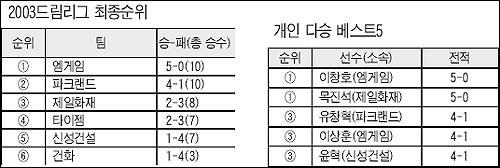 ±¹³» ÃÖÃÊÀÇ ±â¾÷°£ ´ÜüÀüÀÎ 2003µå¸²¸®±×°¡ 5, 6 ¾çÀϰ£ ÆÄÅ©·£µå ´ë ½Å¼º°Ç¼³ ÀüÀ» ³¡À¸·Î ¸·À» ³»·È´Ù. ÃÖÁ¾Àü¼ ÆÄÅ©·£µå´Â À¯Ã¢ÇõÀÌ ¹Ú¿µÈÆÀ» »ó´ë·Î ÁÖÀåÀü¿¡¼ ½Â¸®ÇÑ µ¥ ÈûÀÔ¾î 2´ë1 ½Â, ÁØ¿ì½ÂÆÀ´Ù¿î ¸é¸ð¸¦ °ú½ÃÇß´Ù. ÀÌ ´ë±¹ °á°ú Á¦ÀÏÈÀç¿Í ŸÀÌÁªÀÌ °¢°¢ 3, 4À§¿¡ ·©Å©µÆ°í ½Å¼º°Ç¼³Àº 5À§·Î Ãß¶ôÇß´Ù.