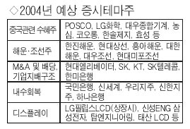 Áõ½ÃÀü¹®°¡µéÀº ´Ü¿¬ Áß±¹ °ü·Ã Á¾¸ñµéÀÌ Å׸¶¸¦ Çü¼ºÇÒ °ÍÀ¸·Î Àü¸ÁÇϰí ÀÖ´Ù. ¿ì¸®³ª¶óÀÇ ´ë(Óß)Áß±¹ ¼öÃâÀº 2003³â¿¡´Â ¹Ì±¹À» Á¦Ä¡°í 1À§¸¦ Â÷ÁöÇß´Ù. ¼öÃâǰ¸ñÀ» º¸¸é ÇÕ¼º¼öÁö, ÄÄÇ»ÅͺÎǰ, ¹«¼±Åë½ÅºÎǰ µî ´ëºÎºÐ ¹ÝÁ¦Ç°À̳ª ¿øÀç·á ¼º°ÝÀÌ´Ù. Áõ½ÃÀÇ ´ëÇ¥ÀûÀÎ Áß±¹ °ü·Ã Å׸¶Á¾¸ñÀ¸·Î´Â POSCO¡¤LGÈÇС¤´ë¿ìÁ¾ÇÕ±â°è¡¤³ó½É µîÀÌ ²ÅÈù´Ù. ´ë½ÅÁõ±ÇÀº Áß±¹ °ü·Ã Å׸¶(Áß±¹ ¼öÃâºñÁß 20% ÀÌ»ó) Á¾¸ñÀ¸·Î ÄÚ¿À·Õ¡¤ÇѼÖÁ¦Áö¡¤¼¼¿øÅÚ·¹ÄÞ¡¤È¿¼º µîÀ» ²Å¾Ò´Ù.
