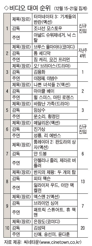 ¡®Å͹̳×ÀÌÅÍ 3¡¯°¡ Ãâ½ÃµÇÀÚ¸¶ÀÚ ºñµð¿À ´ë¿©½ÃÀåÀ» Á¡·ÉÇß´Ù. ¿Ã¿©¸§ Çѱ¹ ¿µÈÀÇ ¸ÍÀ§ ¼Ó¿¡¼µµ ¡®¸ÅÆ®¸¯½º 2¡¯¿Í ÇÔ²² »ì¾Æ³²Àº ÇÒ¸®¿ìµå SF ¾×¼Ç ¡®Å͹̳×ÀÌÅÍ 3¡¯´Â ÀÌÁ¦´Â ͏®Æ÷´Ï¾Æ ÁÖÁö»ç°¡ µÈ ¾Æ³Îµå ½´¿öÁ¦³×°Å°¡ ¸¶Áö¸· È¥½ÅÀÇ ÈûÀ» ½ñ¾ÆºÎÀº ÀÛǰÀÌ´Ù. 56¼¼ÀÇ ³ªÀÌ ¶§¹®¿¡ ¶§·Î´Â °µµ ³ôÀº ¾×¼ÇÀÌ ¹ö°Å¿ö º¸À̱⵵ ÇÏÁö¸¸, ½´¿öÁ¦³×°Å°¡ Á¦¸òÀ» ÇØ³½ º¼°Å¸® ¸¹Àº ¿À¶ô¿µÈÀÓ¿¡´Â Ʋ¸²¾ø´Ù. SF ¿µÈÁö¸¸ ¡®¸ÅÆ®¸¯½º¡¯ ½Ã¸®ÁîÀÇ ³¯·ÆÇÑ Ã·´Ü¾×¼Ç°ú ´Þ¸®, ¼íµ¢¾î¸®ÀÇ ¹«°Ô°¡ ±×´ë·Î ´À²¸Áö´Â °íÀüÀû ¾×¼ÇÀÌ ÁÖ·Î ÆîÃÄÁø´Ù.