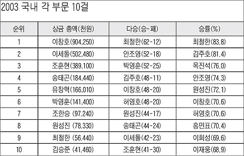 ÀÌâȣ 9¾ï¿ø, À̼¼µ¹ 5¾ï¿ø. Áö³ 2003³â ÇÑ ÇØ µÎ ±â»çÀÇ Áö°©¿¡ µé¾î°£ °¢Á¾ ŸÀÌÆ²Àü »ó±Ý ¾×¼ö´Ù. ÀÌâȣ´Â Ãá¶õ¹è¿Í µµ¿äŸ¡¤µ§¼Ò ¹è ¹× ´ÜüÀüÀÎ Áø·Î¹è µî 3´ë ±¹Á¦ ±âÀü¿¡´Ù ±¹³» Á¤±Ô 5°³ ±âÀüÀ» ¼®±Ç, Áö³ÇØ À¯Ã¢Çõ¿¡°Ô ³»ÁÖ¾ú´ø »ó±Ý¿Õ ÀÚ¸®¸¦ 2³â ¸¸¿¡ µÇã¾Ò´Ù.