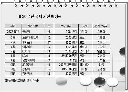 ¿Ã¸²ÇÈÀÌ ¿¸± 2004³âÀº ¹ÙµÏ°è¿¡¼µµ ¿ª»ç»ó °¡Àå ¹Ù»Û 1³âÀÌ µÉ Àü¸Á. ¸ÞÀÌÀú±Þ ±¹Á¦ ´ëȸ¸¸ ¹«·Á 10°³°¡ ²¿¸®¸¦ ¹°°í À̾îÁ® ÃâÀü ±â»ç³ª ÆÒµéÀ̳ª Á¤½ÅÀ» ¸ø Â÷¸± ÆÇÀÌ´Ù.
