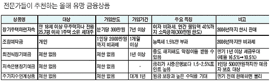 ¡ß¸ñµ· ±¼¸®±â¿¡ ÁÁÀº Á¶ÇÕ¿¹Å¹±Ý°ú ȸÀü½ÄÁ¤±â¿¹±Ý=Àü¿¡ °¡ÀÔÇØµÐ ±ÝÀ¶»óǰÀÇ ¸¸±â°¡ Áö³ª, ÀÏ´Ü ¸ñµ·Àº ¸¶·ÃÇßÁö¸¸ ¸¶¶¥È÷ ÅõÀÚÇÒ °÷À» ¸ø ã°í ÀÖ´Â ÅõÀÚÀÚ¿¡°Ô´Â Á¶ÇÕ¿¹Å¹±ÝÀÌ ´ë¾È(ÓÛäÐ)ÀÌ µÉ ¼ö ÀÖ´Ù. ½Å¿ëÇùµ¿Á¶ÇÕ°ú ³ó¼öÇù´ÜÀ§Á¶ÇÕ¡¤»õ¸¶À»±Ý°í µî¿¡¼ ÆÇ¸ÅÇÏ´Â Á¶ÇÕ¿¹Å¹±ÝÀº 1Àδç 2000¸¸¿ø±îÁö´Â ÀÌÀڼҵ漼°¡ ¸éÁ¦µÇ°í ³ó¾îÃÌÆ¯º°¼¼¸¦ 1.5%¸¸ ¹°±â ¶§¹®¿¡ ¼¼ÈļöÀÍ·üÀÌ ³ô´Ù. Á¶ÇÕ¿¹Å¹±ÝÀº 1³â ÀÌ»ó °¡ÀÔÇØ¾ß ¼¼±Ý¿ì´ë ÇýÅÃÀÌ ÁÖ¾îÁö´Â ÀºÇàÀÇ ¼¼±Ý¿ì´ë»óǰ°ú ´Þ¸®, 1°³¿ù ÀÌ»ó¸¸ °¡ÀÔÇÏ¸é ¼¼±ÝÇýÅÃÀ» ¹ÞÀ» ¼ö Àֱ⠶§¹®¿¡ ´Ü±âÀÚ±ÝÀ» ±¼¸®±â¿¡ ¸Å¿ì À¯¿ëÇÑ »óǰÀÌ´Ù. µû¶ó¼ ºñ°ú¼¼ ÇѵµÀÎ 1Àδç 2000¸¸¿ø±îÁö °¡Á· ¸íÀǸ¦ ÃÖ´ëÇÑ È°¿ëÇØ ÀúÃàÇÒ Çʿ䰡 ÀÖ´Ù. Á¤ºÎ´Â ¿ÃÇØºÎÅÍ Á¶ÇÕ¿¹Å¹±Ý¿¡ ´ëÇØ¼µµ ÀÌÀڼҵ漼¸¦ ¹°¸®·Á°í ÇßÁö¸¸, À۳⠱¹È¸ ½ÉÀÇ °úÁ¤¿¡¼ °ÅºÎ´çÇß´Ù. ÀÌ¿¡ µû¶ó 2006³â ¸»±îÁö´Â Á¾Àü´ë·Î ³óƯ¼¼ 1.5%¸¸ ºÎ°úµÈ´Ù.
