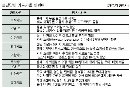 ¼³ ¿¬ÈÞ¸¦ ¾ÕµÎ°í Ä«µå»çµéÀÌ ÇªÁüÇÑ °æÇ°Çà»ç¸¦ ¾Õ¼¼¿ö °í°´µéÀÇ Ä«µå»ç¿ëÀ» µ¶·ÁÇϰí ÀÖ´Ù. Ä«µå»çµéÀÇ °æ¿µ³¿¡ µû¶ó ¿Ã ¼³ ¿¬ÈÞ¿¡´Â ¿¹³âó·³ dz¼ºÇÑ ÇÒÀÎÇýÅÃÀ» ±â´ëÇÒ ¼ö ¾ø´Â °Ô ÈìÀÌÁö¸¸, ¾Ë¶ã ¼Òºñ¸¦ À§Çؼ´Â ¾ó¸¶ ¾È µÇ´Â ÇýÅÃÀ̳ª¸¶ ²Ä²ÄÈ÷ È®ÀÎÇØµÎ´Â ÁöÇý°¡ ÇÊ¿äÇÏ´Ù.