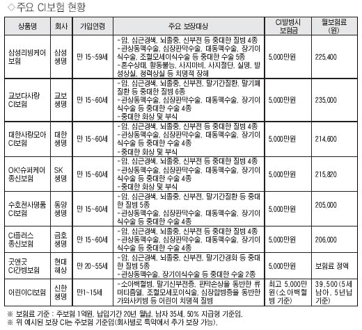 ¡ßCIº¸Çè ÁÖ¿ä»óǰ ¼Ò°³=CIº¸ÇèÀº 2002³â 6¿ù »ï¼º»ý¸íÀÌ ÃÖÃÊ·Î ÆÇ¸ÅÇϱ⠽ÃÀÛÇß°í, ÇöÀç´Â ´ëºÎºÐÀÇ »ý¸íº¸Çè»ç°¡ ÆÇ¸ÅÇϰí ÀÖ´Ù. Çö´ëÇØ»óÀº ¼ÕÇØº¸Çè»ç·Î´Â À¯ÀÏÇÏ°Ô ±Â¾Ø±ÂCI°£º´º¸ÇèÀ» ÆÈ°í ÀÖ´Ù. ÀÌ ¹Û¿¡ ½ÅÇÑ»ý¸íÀÌ ¾î¸°ÀÌÀü¹® CIº¸ÇèÀ» ÆÇ¸ÅÇϰí ÀÖ´Ù.< Ç¥ ÂüÁ¶ >