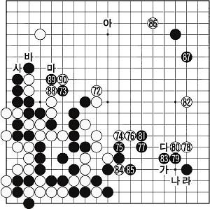 78Àº ¾î¶®À»±î. ½ÅÁßÇÏÁö¸¸ ¸ðÇè½É ºÎÁ·À̶õ Áø´ÜÀÌ ³»·ÁÁ³´Ù. ¡®°¡¡¯·Î °ÉÃÄ Èæ ¡®³ª¡¯¸é ¡®´Ù¡¯·Î ¶Ù°í, ¹é ¡®°¡¡¯ ¶§ Èæ 80ÀÌ¸é ¡®¶ó¡¯¿¡ ºÙ¿© ½±°Ô ÀâÈú ¸»ÀÌ ¾Æ´Ï¶ó´Â °Í. 83±îÁö ÇϺ¯ÀÌ Á¦¹ý ÅëÅëÇØÁ³´Ù. 83À¸·Î 86¿¡ ±»Çô ¿å½ÉÀ» ³»¸é Âü°í 2µµ 11±îÁö ¾È¹æÀ» ³»ÁÖ°Ô µÈ´Ù. 88·Î ¹«°Ì°Ô ¿òÁ÷ÀÎ ¼ö°¡ ±Ü¾î ºÎ½º·³. ¹é ¡®¸¶¡¯, Èæ 88, ¹é ¡®¹Ù¡¯, Èæ ¡®»ç¡¯ ±³È¯ ÈÄ ¡®¾Æ¡¯·Î ¹ú·Á°¬À¸¸é ¾ÆÁ÷ ±ä ¹ÙµÏÀ̾ú´Ù´Â Áß·ÐÀ¦.