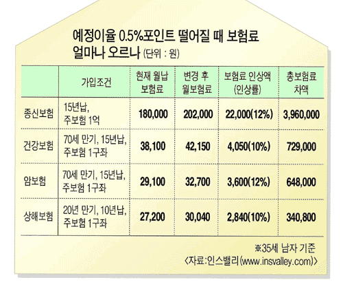º¸ÇèÀü¹® ÀçÅ×Å© »çÀÌÆ®ÀÎ ¡®Àνº¹ë¸®(www.insvalley.com)¡¯¿¡ µû¸£¸é, ¿¹Á¤ÀÌÀ²ÀÌ 0.25%Æ÷ÀÎÆ® ³·¾ÆÁö¸é º¸Çè·á´Â Æò±Õ 5% °¡·® ¿À¸£¸ç, 0.5%Æ÷ÀÎÆ® ¶³¾îÁö¸é º¸Çè·á´Â Æò±Õ 10% °¡·® ÀλóµÈ´Ù. Àνº¹ë¸® ¼º´³² ´ëÇ¥´Â ¡°´ëºÎºÐ º¸Çè»ç°¡ ¿¹Á¤ÀÌÀ²À» 0.5%Æ÷ÀÎÆ® ³·Ãâ ¹æÄ§À̱⠶§¹®¿¡, 4¿ù ÀÌÈÄ º¸Çè·á ÀλóÆøÀº 10%°¡ µÉ Àü¸Á¡±À̶ó°í ¸»Çß´Ù.