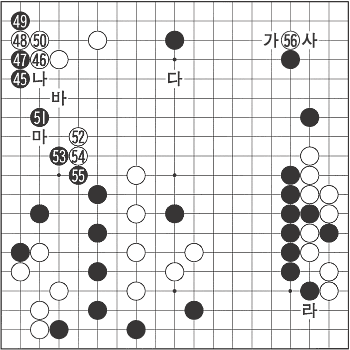 ¿©±â¼ Àïó(î³ô¥)ÀÎ ¡®°¡¡¯·Î ³¯¾Æ°¥ ¼ö´Â ¾øÀ»±î. ±×·¯³ª ±×°ÍÀº Âü°í 2µµÃ³·³ Áº¯ÀÌ ¾¦¹çÀÌ µÇ¹Ç·Î ¸ø °ßµò´Ù. 54±îÁö ¼±¼öÇÑ ¹é, ¹Ù¶÷ó·³ ¸öÀ» µ¹·Á 56¿¡ ºÙ¿©°£´Ù. ÀÌÁ¦ Ä®Àڷ縦 ³Ñ°Ü¹ÞÀº ÈæÀÌ °í½ÉÇÒ Â÷·Ê. ¡®°¡¡¯¿Í ¡®»ç¡¯ µÑ Áß ¾îµð°¡ ¿ÇÀ»±î?