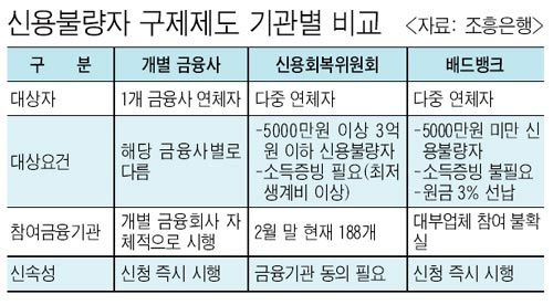 Á¤ºÎ¿Í °¢ ±ÝÀ¶È¸»ç°¡ 380¸¸¸í¿¡ À°¹ÚÇÏ´Â ½Å¿ëºÒ·®ÀÚ ±¸Á¦´ëÃ¥À» ¼Ó¼Ó ³»³õ°í ÀÖÁö¸¸, ½Å¿ëºÒ·®ÀÚµéÀº ÀÚ½ÅÀÌ ±¸Á¦´ë»ó¿¡ Æ÷ÇԵǴÂÁö, ±×¸®°í ¾î¶² Á¦µµ¸¦ ÀÌ¿ëÇÏ´Â °ÍÀÌ Á¦ÀÏ À¯¸®ÇÑÁö µîÀ» ¸ô¶ó ¿ì¿ÕÁ¿ÕÇϰí ÀÖ´Ù. ½Å¿ëºÒ·®ÀÚ°¡ ÀÌ¿ëÇÒ ¼ö ÀÖ´Â ¡ã°³º°±ÝÀ¶»ç ÀÚü ±¸Á¦Á¦µµ ¡ã°³ÀοöÅ©¾Æ¿ô(½Å¿ëȸº¹À§¿øÈ¸) ¡ã¹èµå¹ðÅ© µî 3°¡Áö ½Å¿ëȸº¹Á¦µµ¿¡ ´ëÇØ ¾Ë¾Æº»´Ù.