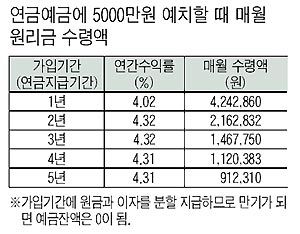 Áï½Ã¿¬±Ý¿¹±ÝÀº Á¤±â¿¹±Ý ¼öÁØÀÇ ÀÌÀÚ°¡ Áö±ÞµÇ´Â È®Á¤±Ý¸® »óǰÀ¸·Î, ½ÅŹ»óǰ°ú ´Þ¸® ¸Å¿ù ¿¬±ÝÁö±Þ¾×ÀÌ ÀÏÁ¤Çϱ⠶§¹®¿¡ ¾ÈÁ¤ÀûÀÎ Àڱݼ³°è°¡ °¡´ÉÇÏ´Ù. °¡ÀԱⰣÀº 1~5³â À̳»¿¡¼ Á¤ÇÒ ¼ö ÀÖ´Ù. ÇöÀç 5³âÁ¦ ¿¬±Ý¿¹±ÝÀÇ ÀÌÀ²Àº ¿¬ 4.3% ¼öÁØÀ¸·Î, 5000¸¸¿øÀ» ¿¹Ä¡ÇÒ °æ¿ì 5³â°£ ¸Å´Þ 91¸¸2000¿ø¾¿ ¿¬±ÝÀÌ Áö±ÞµÈ´Ù. ´Ü, 5³â°£ ¿ø¸®±ÝÀÌ ºÐÇÒÁö±ÞµÇ¹Ç·Î 5³â ÈÄ¿¡´Â ¿ø±Ý Àܾ×ÀÌ Á¦·Î(0)°¡ µÈ´Ù.