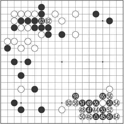 Èæ¸¸ ÇØµµ »·ÇÑ Ä§ÀÔÀε¥ ¹éÀÇ ÀÔÀå¿¡¼± ¾î·Æ½À´Ï´Ù. ¹é 53ÀÇ ½ÖÁ¡ ´ëÀÀÀº ÈæÀÌ ½±°Ô Å͸¦ Àâ´Â´Ù°í º¸°í °í¹Î ³¡¿¡ 44·Î ºÙ¿©°©´Ï´Ù. 56±îÁö ¹éÀ» °ø°ÝÇϰڴٴ ¶æÀÌÁÒ. 48·Î 50¿¡ ´Ã¸é Âü°í 1µµ 5±îÁö ¿Ü¼¼¸¦ ¾ò½À´Ï´Ù¸¸, ¼±¼ö¸¦ ÀâÀº Èæ¿¡°Ô 6ÀÇ Å« °÷À» ³»Áà ºÒ¸¸ÀÔ´Ï´Ù.