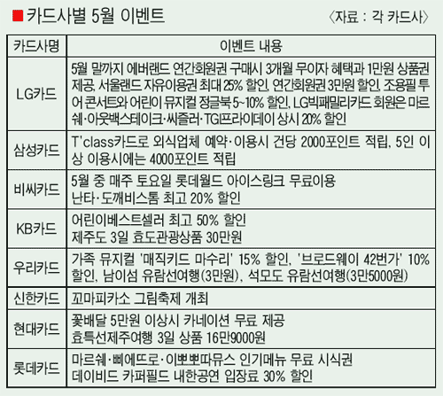 °¡Á·´ÜÀ§ ³ªµéÀ̰¡ ¸¹Àº °¡Á¤ÀÇ ´Þ 5¿ùÀ» ¸Â¾Æ ½Å¿ëÄ«µå»çµéÀÌ °¢Á¾ °ø¿¬°ú ¿©Çà»óǰ, ¿Ü½Ä¾÷ü ÇÒÀÎ µî ´Ù¾çÇÑ À̺¥Æ®¸¦ ¼±º¸À̰í ÀÖ´Ù. ³ªµéÀ̸¦ ¾ÕµÎ°í ³» Ä«µå·Î ¹ÞÀ» ¼ö ÀÖ´Â ÇýÅÃÀ» ¸ÕÀú Á¡°ËÇÏ´Â °ÍÀº ¾Ë¶ã ¼ÒºñÀÇ ±âº»ÀÌ´Ù.
