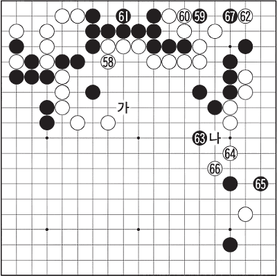 <Á¦4º¸>(58~67)=58Àº ¿ÀÀü ´ë±¹ ºÀ¼ö(Üæâ¢)Á¡. ÀϺ»ÀÇ ÀÌÆ²°ÉÀÌ ¹ÙµÏ¿¡¼± ¸¶Áö¸· ¼ö¸¦ ºñ¹Ð¸®¿¡ ±âÀÔÇØ ³Ö°í ´ÙÀ½ ³¯ °³ºÀÇÑ´Ù. »ó´ë¹æÀÌ ¹ã»õ ¿¬±¸ÇÒ ¿©Áö¸¦ ºÀ¼âÇÏ·Á´Â ¶æ. ÇÏÁö¸¸ ÇϷ縸¿¡ ³¡³ª´Â ±¹³»¿¡¼± ±×·¸°Ô±îÁö ÇÏÁö´Â ¾Ê´Â´Ù. 58ÀÌ ¿¹»óÄ¡ ¸øÇÑ °Å¸¿´´ø µí, Á¡½É½Ã°£ ³»³» ½É°¢ÇÑ Ç¥Á¤ÀÌ´ø ¸ñÁø¼®Àº ¿ÀÈÄ ´ë±¹ Àç°³ ÈÄ¿¡µµ 5ºÐÀ» ´õ °í½ÉÇß´Ù. 58¿¡ ´ëÇÑ ÀÀ¼ö¿¡ ¹«