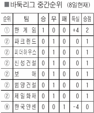 ù ¶ó¿îµå Á¾·á °á°ú ÆÀ ¼øÀ§¿¡¼± ÇѰÔÀÓ(1½Â)°ú Çѱ¹¾á¼¾(1ÆÐ)À» Á¦¿ÜÇÑ ³ª¸ÓÁö 6°³ ÆÀÀÌ ¸ðÁ¶¸® 1¹«½ÂºÎ¸¦ ±â·Ï ÁßÀÌ´Ù. °³ÀÎ ÀüÀû¿¡¼± ÁÖÀå ±×·ì Áß ÀÌâȣ(ÇÇ´õÇϿ콺) À̼¼µ¹(ÇѰÔÀÓ) ¼ÛŰï(º¸ÇØ) ¹Ú¿µÈÆ(Á¦ÀÏÈÀç)ÀÌ ¼ÀüÀ» Àå½ÄÇß´Ù. ÇÑÆí 1¶ó¿îµå 16±¹ Áß ¼±¹ß »óÀ§ ¼ø¹ø ¼±¼ö°¡ ÇÏÀ§ ¼ø¹ø ¼±¼ö¿¡°Ô 6½Â 10ÆÐ·Î µÚÁø °ÍÀ¸·Î ³ªÅ¸³µ´Ù. 2¶ó¿îµå´Â 10ÀϺÎÅÍ ¹ü¾ç°Ç¿µ(À¯Ã¢Çõ À±ÁØ»ó ¹ÚÁ¤»ó ¼ºÀ¼ö) ´ë ½Å¼º°Ç¼³(ÃÖöÇÑ Ç㿵ȣ ±è½ÂÁØ ¾çÀçÈ£)ÀÇ ¼¿ ¿ª¼øÀ¸·Î ½ºÅ¸Æ®ÇÑ´Ù.
