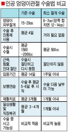 °æÈñ´ëº´¿ø Á¤Çü¿Ü°ú À¯¸íö ±³¼öÆÀÀº ¾ûµ¢ÀÌ¿Í »ô(»çŸ±¸´Ï) ¾ÈÂÊÀ» °¢°¢ 6§¯ Á¤µµ¸¸ Àý°³Çϰí, ±ÙÀ°°ú ÈûÁÙ°ú Àδ븦 ÀÚ¸£Áö ¾ÊÀº ä ¼ö¼úÇÏ´Â ¡®ÃÖ¼ÒÀý°³Àΰø¾ûµ¢À̰üÀý¼ö¼ú¹ý¡¯À¸·Î 50¿©¸íÀÇ È¯ÀÚ¸¦ ¼ö¼úÇØ ¸ðµÎ ¼º°øÇß´Ù°í ÃÖ±Ù ¹àÇû´Ù. Áö±Ý±îÁö Àΰø ¾ûµ¢ÀÌ °üÀý ¼ö¼úÀº ¾ûµ¢ÀÌ ÂÊÀ» ÃÖ°í 15~20§¯±îÁö Àý°³Çϰí, Àδë¿Í ÈûÁÙÀ» ¸ðµÎ ÀÚ¸¥ ä ¼ö¼úÇÏ´Â °Ô º¸ÅëÀ̾ú´Ù. À¯ ±³¼ö´Â ±×·¯³ª Àΰø °üÀýÀÌ µé¾î°¥ ÁöÁ¡ ¾çÂÊ ÇǺθ¦ Àý°³ÇÑ µÚ ÈûÁÙ°ú Àδ븦 Á¥Çô °ø°£À» ¸¶·ÃÇϰí, ±× °ø°£À» ÅëÇØ Àΰø°üÀýÀ» »ðÀÔÇÏ´Â ¹æ¹ýÀ» »ç¿ëÇß´Ù.