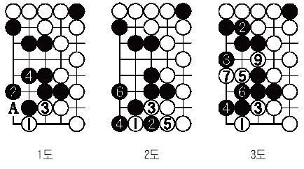 <1µµ>(½ÇÀüÁøÇà) ¹é 1ÀÌ ±Þ¼Ò. Èæ 4±îÁö ÁøÇàµÈ ´ÙÀ½ ¹é AÀÇ ²É³îÀÌ ÆÐ°¡ ½ÃÇÑ ÆøÅºÀ¸·Î ³²¾Æ ¹éÀÌ ¿ì¼¼¸¦ È®¸³Çß´Ù. <2µµ> Èæ 2, 4´Â Èæ 6 ÀÌÈÄ 7(1ÀÇ °÷)·Î µû³» ¿ª½Ã ÆÐÀÇ °á¸». <3µµ> ¹é 1¿¡ ÈæÀÌ 2, 4·Î ¹öƼ´Â °ÍÀº ¹é 3, 5°¡ ±Þ¼Ò·Î, 9¿¡ À̸£¸é ÀÚÃæÀ¸·Î »ç¸ÁÇÑ´Ù. (156¼ö ³¡, ¹é ºÒ°è½Â)