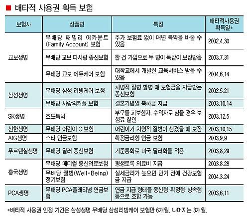 º¸Çè»ç¸¶´Ù ºñ½ÁÇÑ º¸Àå ³»¿ëÀ» ³»³õ´Â Å¿¿¡ ÀÔ¸ÀÀ» ÀÒÀº ¼ÒºñÀÚµéÀº ÀÌ·± ¡®¾ÆÀ̵ð¾î¡¯ »óǰ Áß¿¡¼ Àڽŵé ÃëÇâ¿¡ ¸Â´Â º¸ÇèÀ» °í¸¦ ¼ö ÀÖ´Ù. »ýº¸¾÷°è¿¡¼± ÀÌ Á¦µµ°¡ µµÀÔµÈ 2001³â 12¿ùºÎÅÍ ÇöÀç±îÁö 12°ÇÀÇ ½Å»óǰÀÌ ¡®¹èŸÀû »ç¿ë±Ç¡¯À» ºÎ¿©¹Þ¾Ò´Ù.