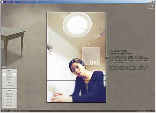 ¡®4ÀÎ¿ë ½ÄŹ¡¯ÀÇ È¨ÆäÀÌÁö(¿µ¹®Á¦¸ñ ¡®The uninvited¡¯)´Â, Á¢¼ÓÇÏ´Â µ¿½Ã¿¡ ¹Ú½Å¾ç°ú ÀüÁöÇöÀÌ ½ÄŹ¿¡ ¸¶ÁÖ¾É¾Æ ÀÖ´Â Àå¸éÀÌ ³ª¿À¸é¼ Áø½Ç(Truth), »ç½Ç(Fact) µÎ °³ÀÇ ¸Þ´º°¡ ¶á´Ù. Áø½ÇÀ» Ŭ¸¯ÇÏ¸é ´ëÈ¡¤±â¾ï¡¤¹ÏÀ½¡¤»ó½Ç µîÀÇ ±ÛÀÚ°¡ ¶°¿À¸£¸ç, ¿µÈ ¼Ó À̹ÌÁö°¡ ȸéÀ» ä¿î´Ù.