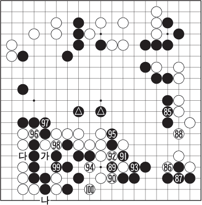 ÇÏÁö¸¸ Á¶ÇѽÂÀº õÇÏÅÂÆò, ¹Ì¸® »ý°¢ÇØ µÎ¾ú´Ù´Â µí 96, 98À» ¼±¼öÇϰï 100±îÁö ôô µÎ¾î°£´Ù. ÂøÁ¡¿¡ ¸Á¼³ÀÓÀ̶ó°ï ¾ø´Ù. ¿©±â¼ Èæ ¡®°¡¡¯¸é ¹é ¡®³ª¡¯·Î ³Ñ¾î ÈæÀÌ ¸ÕÀú ÀâÈù µíÇÏÁö¸¸, ¸Ô¿©Ä¡°í Èæ ¡®´Ù¡¯¸é ¹éÀÇ ¹«¸®°¡ ±Ý¹æ µå·¯³´Ù. ±×·¸´Ù¸é 100À¸·Î ¡®°¡¡¯¿¡ ¸ÕÀú ÆÄÈ£(÷òûÂ)Çϸé ÁÂÇÏ ÀÏ´ë ÈæÀÇ ¸ñ¼ûÀº ¾îÂî µÉ±î. ´ÙÀ½ º¸¿¡¼ ¡®Á¤´ä¡¯°ú ¸ÂÃç º¸½Ãµµ·Ï.