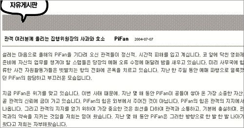 ´çÃÊ Áö³ 1ÀÏ ÀÎÅÍ³Ý ¿¹¸Å¸¦ ½ÃÀÛÇÏ·Á Çß´ø ºÎõ¿µÈÁ¦ »ç¹«±¹Àº ½Ã½ºÅÛ ¿À·ù·Î ÀÎÇØ µÎ Â÷·Ê³ª ³¯Â¥¸¦ ¿¬±âÇÑ ³¡¿¡ 9ÀÏ ¿ÀÀü 11½Ã ¿¹¸Å¸¦ ´Ù½Ã ½ÃÀÛÇß´Ù. 9ÀÏ ¿ÀÈÄ ¿µÈÁ¦ÃøÀº ¡°¿¹¸Å°¡ ¼øÁ¶·Ó°Ô ÁøÇàµÇ°í ÀÖ´Ù¡±°í ¹àÇûÁö¸¸ ¿µÈÁ¦ ȨÆäÀÌÁö(www.pifan.com)¿¡´Â ¿¹¸ÅÃë¼Ò¿Í ȯºÒ µî¿¡ ´ëÇÑ Ç×ÀÇÀÇ ±ÛµéÀÌ ºø¹ßÄ¡°í ÀÖ´Ù.
