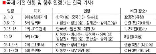 ÇÑ¡¤Áß ¹ÙµÏ ´ëÀü(ÓÞîú). Çѱ¹°ú Áß±¹ Á¤»ó±Þ ½ºÅ¸µé °£ÀÇ ÆÐ±ÇÀ» °Ç °Ýµ¹ÀÌ ÁÙÀ» ÀÕ°í ÀÖ´Ù. Áö³ÁÖ ¸¶Áö¸· 2¸íÀ» °¡·Á³½ Á¦2ȸ µµ¿äŸ¡¤µ§¼Ò¹è °á½ÂÀÌ ¹ú¾îÁú ³»³â 1¿ù±îÁö ¾ÕÀ¸·Î ³²Àº ±¹Á¦ ´ëȸ´Â ¸ðµÎ 6°³(´ÜüÀü Á¦¿Ü). ±× ´ëºÎºÐÀÌ Çѱ¹¼¼¿Í Áß±¹¼¼ÀÇ ¸Â´ë°áÀ̰í, ƯÈ÷ ÀÌâȣ À̼¼µ¹(ÀÌ»ó Çѱ¹), âÇÏ¿À(ßÈûÄ¡¤Áß±¹) µîÀÌ °¡Àå µÎ°¢À» º¸¿©ÁÖ°í ÀÖ´Ù.