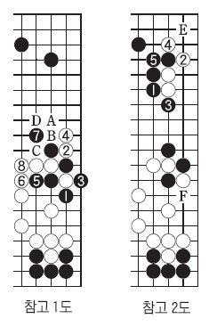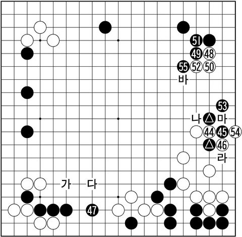 ¤°í ³Ñ¾î°¥ °ÍÀº 46 ¶§ ¡®¶ó¡¯·Î Àâ´Â ¼ö´Â ¾ø´Ù´Â Á¡. Âü°í 1µµ 8 ÀÌÈÄ Èæ A°¡ ÀÌÇÏ D±îÁö ºÎÈ£ ¼øÀ¸·Î ¼º¸³ÇÏÁö ¾Ê´Â´Ù. 48Àº ¡®¸¶¡¯·Î ÀâÀ» °÷. À§ºóÀÇ ÈïºÐ»óŰ¡ °¨ÁöµÈ´Ù. ±×·¯³ª Èæµµ 51ÀÌ ¹®Á¦·Î, Âü°í 2µµ¿´À¸¸é 5 ´ÙÀ½ E¿Í F¸¦ ¸ÂºÁ ¹éÀÌ ³Ã³Çß´Ù. ¹é 2·Î 3À̸é Èæ 2. ±×³ª Àú³ª 55¶§ ¹éÀº ¡®¹Ù¡¯·Î Á¥Èú ¼ö ÀÖÀ»±î, ¾øÀ»±î?