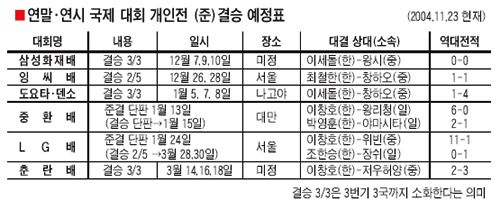 ¡®ÇÑ¡¤Áß ¹ÙµÏ ´ëÀü(ÓÞîú).¡¯ Çѱ¹°ú Áß±¹ÀÇ Åé ½ºÅ¸µéÀÌ ¿Ã °Ü¿ïºÎÅÍ ³»³â º½±îÁö ±¹Á¦ ´ëȸ °á½Â¼ ¿¬¼Ó ¸Â´ë°áÇÏ´Â ¡®¹ÙµÏ ¼î¡¯¸¦ ÆîÄ£´Ù. 12¿ù 7ÀÏ ½ÃÀ۵Ǵ »ï¼ºÈÀç¹è¸¦ ½ÅȣźÀ¸·Î ÇöÀç ÀÏÁ¤ÀÌ ÀâÈù 4°³ ´ëȸ °á½Â Ä«µå°¡ ¸ðÁ¶¸® ÇÑ¡¤ÁßÀü. ¾ÆÁ÷ Áذá½ÂÀ» ³²±ä LG¹è¸¦ ³ÖÀ¸¸é ÀüÀå(îúíÞ)Àº ¹«·Á ´Ù¼¸ ±ºµ¥¿¡ À̸¥´Ù. ³ó½É¹è Á¤°üÀå¹è µî ´ÜüÀüÀ» Æ÷ÇÔÇÒ °æ¿ì ¾ç±¹ °£¿£ °ÅÀÇ ¸ÅÀÏ Æ÷źÀÌ ¿À°í °£´Ù´Â °è»ê.