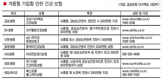 º¸Çè»çµéÀº ³úÁ¹Áß¡¤³ú°æ»ö¡¤³úÃâÇ÷ µî ´Ù¾çÇÑ Áúº´À» º¸ÀåÇÏ´Â º¸ÇèÀ» ÆÇ¸ÅÇϰí ÀÖÀ¸¸ç, ÃÖ±Ù¿¡´Â ÀüÈ¿Í ÀÎÅͳÝÀ¸·Î °¡ÀÔÀÌ °¡´ÉÇÑ ´ÙÀÌ·ºÆ® º¸Çèµµ ¼±º¸À̰í ÀÖ´Ù.