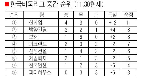 ÇѰÔÀÓ(4½Â 3¹«)°ú º¸ÇØ(1½Â 6¹«)´Â 2´ë2·Î ºñ°Ü °¢°¢ ¹«ÆÐ¸¦ À¯ÁöÇß´Ù. ÇѰÔÀÓÀº 1À§°¡ È®Á¤µÆÀ¸¸ç, 3À§ º¸ÇØ´Â ³²Àº ´ëÁø °á°ú¿¡ µû¶ó 2À§±îÁö ³ë¸± ¼ö ÀÖ°Ô µÆ´Ù. 2004 ¹ÙµÏ¸®±×´Â ÀÌ·Î½á Æ÷½ºÆ® ½ÃÁð ÁøÃâ 4ÆÀ Áß ÇѰÔÀÓ ¹ü¾ç°Ç¿µ º¸ÇØ µî 3ÆÀÀÌ °áÁ¤µÆ°í, ³²Àº ƼÄÏ ÇÑ ÀåÀº 12¿ù 2ÀÏ ½ÃÀÛµÉ ¹ü¾ç°Ç¿µ ´ë Á¦ÀÏÈÀç Àü °á°ú¿¡ µû¶ó ÆÄÅ©·£µå ¶Ç´Â Á¦ÀÏÈÀç¿¡ µ¹¾Æ°¡°Ô µÆ´Ù.