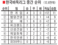 2004 Çѱ¹ ¹ÙµÏ¸®±× Æ÷½ºÆ®½ÃÁð ÁøÃâ 4°ÀÌ ¸ðµÎ È®Á¤µÆ´Ù. Áö³ ÁÖ ´ë±¹¼ ¹ü¾ç°Ç¿µÀº Á¦ÀÏÈÀç¿Í 2´ë2 ¹«½ÂºÎ¸¦ ±â·ÏÇÏ¸ç ½ÂÁ¡ 9Á¡À» ȹµæ, ÇѰÔÀÓ(11Á¡)¿¡ À̾î 2À§°¡ È®Á¤µÆ´Ù. º¸ÇØ(8Á¡)¿Í ÆÄÅ©·£µå(7Á¡)°¡ °¢°¢ 3, 4À§. ¸·ÆÇ ´ë¿ªÀü °¡´É¼ºÀ» Àâ¾Ò´ø Á¦ÀÏÈÀç´Â ÃÖÁ¾ ÁÖÀå±¹¼ ¹Ú¿µÈÆÀÌ À¯Ã¢Çõ¿¡°Ô ÆÐÇÏ´Â ¹Ù¶÷¿¡ 6À§¿¡ ¸Ó¹°·¶´Ù.