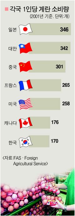 ¹Ì±¹Çؿܳó¾÷ó(FAS) 2001³â Åë°è¿¡ µû¸£¸é ¿ì¸®³ª¶ó 1ÀÎ´ç °è¶õ ¼Òºñ·®Àº ¿¬°£ 170°³. ÀϺ»(346), ´ë¸¸(342°³), Áß±¹(301°³), ¹Ì±¹(258°³), ÇÁ¶û½º(265°³) µîÀÇ 50~70% ¼öÁØÀÌ´Ù. Á¶»ç´ë»ó 26°³±¹ Áß 19À§¿´´Ù. ±×³ª¸¶ Á¦°ú, Á¦»§, À¯Á¦Ç°, ¸¶¿ä³×Áî µîÀÇ »ý»ê¿¡ ¼Ò¿äµÇ´Â °£Á¢¼Òºñ·® 100~120°³¸¦ »©¸é Á÷Á¢ ¼Òºñ·®Àº 1Àδç 60~70°³ ¼öÁØÀÌ´Ù. ´ëÇѾç°èÇùȸ ÃÖ¿µÈƾ¾´Â ¡°ÃÖ±ÙÀÇ À£ºù¿Ç³¿¡´Ù Á¶·ùµ¶°¨ ÆÄµ¿±îÁö °ãÃÄ 2004³â ¼Òºñ·®Àº FASÀÇ 2001³â °ø½Ä Åë°èº¸´Ù 10% ÀÌ»ó °¨¼ÒÇß´Ù¡±°í ¸»Çß´Ù.
