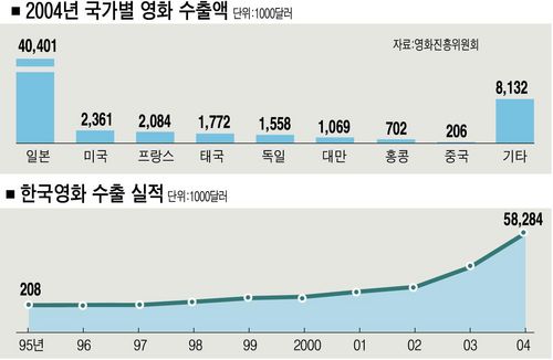ÀÛǰ ´ç °¡°Ýµµ Å©°Ô ³ô¾ÆÁ® Áö³ÇØ ÀÛǰ´ç Æò±Õ ¼öÃâ°¡°ÝÀº 30¸¸436´Þ·¯(¾à3¾ï900¸¸¿ø)·Î 2003³â 18¸¸8896´Þ·¯¿¡ ºñÇØ ¿ª½Ã 67% ÀÌ»ó °ªÀÌ ¿Ã¶ú´Ù. Áö³ÇØ ¼öÃâµÈ Çѱ¹¿µÈ´Â ¸ðµÎ 194ÆíÀ¸·Î, 2003³âÀÇ 164Æí¿¡ ºñÇØ 32ÆíÀÌ ´Ã¾ú´Ù.