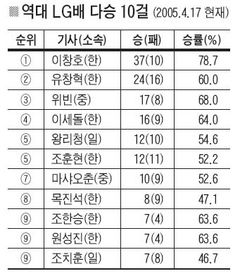 ¡®Çѱ¹ ±â»çµéÀÇ ¾ÆÁöÆ®¡¯·Î ºÒ·Á ¿Â LG¹è¿¡¼ °¡Àå µ¸º¸ÀΠȰ¾àÀ» º¸¿´´ø ¿Ü±¹ ±â»ç´Â À§ºó. ¹«·Á 25±¹À» µÎ¾î 17½Â8ÆÐ¸¦ ±â·ÏÇØ ´Ù½Â 3À§¿¡ ·©Å©µÆ´Ù. 17½Â Áß 4½ÂÀº °á½ÂÀü¿¡¼ ÀÛ¼ºÇÑ °ÍÀÌ¾î¼ ´õ¿í ºû³´Ù. À§ºóÀº ½Â·ü ºÎ¹®¼µµ 68%¸¦ ¸¶Å©ÇØ ÀÌ ´ëȸ¿ÍÀÇ °¢º°ÇÑ Àο¬À» ±â·ÏÀ¸·Î ÀÔÁõÇϰí ÀÖ´Ù. À§ºó°ú ÇÔ²² 9ȸ ´ëȸ ÆÐ±ÇÀ» ´ÙÅõ°í ÀÖ´Â À彬´Â À§ºó°ú´Â Á¤ ¹Ý´ë ÄÉÀ̽º. óÀ½ ÃâÀüÇÑ À̹ø Á¦9ȸ ´ëȸ¼¸¸ 5½Â1ÆÐ¸¦ ±â·Ï ÁßÀÌ´Ù. ´ë±¹ ¼ö°¡ Àû±ä ÇÏÁö¸¸ ±×·¡µµ ¾ö¿¬ÇÑ ½Â·ü 1À§(83.3%)´Ù.