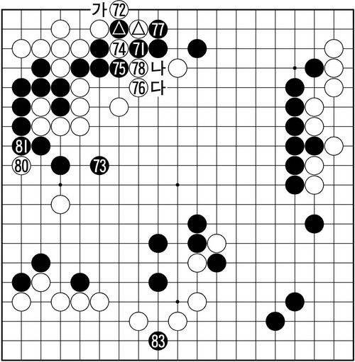 ´ç¿¬ÇÑ 74, 75 ±³È¯ ÀÌÈÄ 76ÀÌ ¶ÇÇÑ À½¹ÌÇÒ ¸¸ ÇÏ´Ù. 76À¸·Î 78¿¡ ²÷À¸¸é Èæ ¡®³ª¡¯, ¹é 76, Èæ ¡®´Ù¡¯·Î ¿ìÁß¾Ó Èæ¼¼°¡ ºÎȰÇÏ¸é¼ ÆÐ´Â ÆÐ´ë·Î ³²´Â °á°ú. Èæµµ 77¿¡ µÎ¾î 78ÀÇ Àý´ÜÀ» °¿äÇÑ µÚ ºñ·Î¼Ò ÆÐ¸¦ µû³½´Ù. ¿ä¼Ò(é©á¶)¸¦ ÇâÇÑ Èæ ¹é °£ÀÇ ¹ß¸®(volley) °ø¹æÀÌ º¼ ¸¸ÇÏ´Ù. ÈæÀº ÆÐ°¨À¸·Î 83¿¡ Ä¡ÁßÇØ°¬´Âµ¥¡¦. (79¡¦?, 82¡¦74)