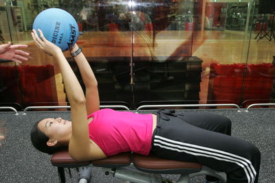 ÀÇÀÚ¿¡ ÆíÇÏ°Ô ´©¿î »óÅ¿¡¼ ÆÈ²ÞÄ¡¸¦ ¾à°£ ±ÁÇô °ø(Medicine Ball)À» ÃÖ´ëÇÑ ¸Ó¸® µÚÂÊÀ¸·Î ³»·È´Ù°¡ °¡½¿ À§±îÁö ²ø¾î ¿Ã¸°´Ù