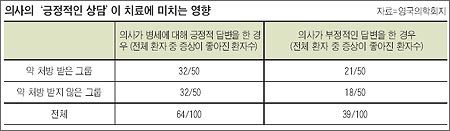 ÀÇ»çµéÀÇ Åµµµµ ȯÀÚÀÇ º´¼¼¿¡ ¿µÇâÀ» ¹ÌÄ£´Ù. ¿µ±¹ÀÇÇÐÇùȸÁö¿¡´Â º´¼¼°¡ ºñ½ÁÇÑ Á¤µµÀÇ ±âħÀ̳ª ÄÚ¸·Èû, ±ÙÀ°ÅëÀ̳ª º¹Åë µîÀ» È£¼ÒÇÏ´Â 200¸íÀÇ È¯ÀÚµéÀ» 4±×·ìÀ¸·Î ³ª´² ÀÇ»çÀÇ Åµµ¿¡ µû¸¥ Áõ»ó È£Àü °æ°ú¸¦ ºñ±³ ºÐ¼®ÇÑ ¿¬±¸°á°ú°¡ ¹ßÇ¥µÆ´Ù. 1±×·ì¿¡°Ô´Â ¡°°ð ³ªÀ» °Ì´Ï´Ù¡±¶ó¸ç ¾à¹° ó¹æÀ» Çß°í, 2±×·ìÀº ¡°¾àÀ» ¾È ¸Ô¾îµµ °ð ³ªÀ» °Ì´Ï´Ù¡±¶ó°í Çß´Ù. 3±×·ì¿¡°Ô´Â ¡°¾àÀÌ È¿°ú°¡ ÀÖÀ» Áö ¸ð¸£°Ú´Ù¡±¶ó°í Çß°í, 4±×·ì¿¡°Ô´Â ¡°¹®Á¦°¡ ¹ºÁö È®½ÇÄ¡ ¾Ê¾Æ ¾à ó¹æÀÌ Èûµé´Ù¡±°í Çß´Ù.