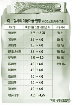 Áö³ÇØ¿£ ´ëºÎºÐÀÇ º¸Çè»çµéÀÌ ¿¹Á¤ÀÌÀ²À» ³»·ÈÁö¸¸, ¿ÃÇØ´Â °¢ »ç¸¶´Ù »çÁ¤ÀÌ ´Ù¸£´Ù. ¿ì¼± »ï¼º¡¤´ëÇÑ¡¤±³º¸¡¤¾Ë¸®¾ÈÃ÷ µî ´ëÇü º¸Çè»çµéÀº ¿¹Á¤ÀÌÀ²À» 0.5%Æ÷ÀÎÆ® ¿Ã¸°´Ù. µû¶ó¼ ÀüüÀûÀ¸·Î º¸¸é, º¸Çè·á´Â 10% Á¤µµ ½ÎÁø´Ù. ¹Ý¸é, µ¿ºÎ»ý¸íÀº ¿¹Á¤ÀÌÀ²À» ¿¬ 4.0%·Î, 0.25%Æ÷ÀÎÆ® ³·Ãâ ¿¹Á¤ÀÌ¾î¼ º¸Çè·á´Â ºñ½ÎÁø´Ù. ½ÅÇÑ¡¤µ¿¾ç¡¤±ÝÈ£»ý¸í µîÀº ¿¹Á¤ÀÌÀ²À» Á¶Á¤ÇÏÁö ¾Ê±â ¶§¹®¿¡ ¿¹Á¤ÀÌÀ²·Î ÀÎÇÑ º¸Çè·á º¯µ¿Àº ¾ø´Ù.