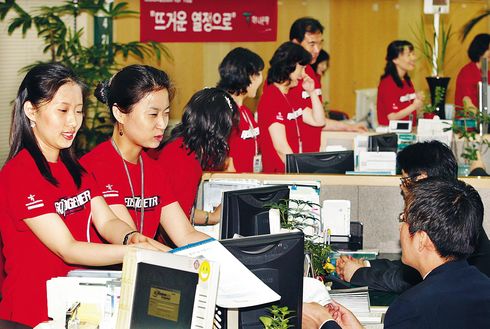 ÇϳªÀºÇà¿¡¼ ±Ý¿äÀϸ¶´Ù ºÓÀº¾Ç¸¶ Ƽ¼ÅÃ÷¸¦ ÀÔ°í ±Ù¹«ÇÏ´Â Á÷¿øµé. »çÁøÁ¦°ø=ÇϳªÀºÇà