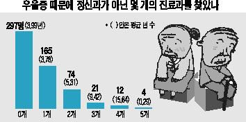 °í·Á´ëÀÇ´ë ¾È¾Ïº´¿ø Á¤½Å°ú À̹μö ±³¼ö°¡ ¿ì¿ïÁõ ȯÀÚ 573¸íÀ» Á¶»çÇÑ °á°ú ¿ì¿ïÁõ ȯÀÚ°¡ ÀÚ½ÅÀÌ º´À» ÀÚ°¢Çؼ Á¤½Å°ú Àǻ縦 ãÀº °æ¿ì´Â ÀüüÀÇ 22%(122¸í)¿¡ ºÒ°úÇß´Ù. 36%(201¸í)´Â °¡Á·À̳ª Ä£ÁöÀÇ ±ÇÀ¯ ¶§¹®¿¡, 35%(195¸í)´Â ´Ù¸¥ Áø·á°ú ÀÇ»çÀÇ ±ÇÀ¯ ¶§¹®¿¡ Á¤½Å°ú Àǻ縦 ã¾Ò´Ù.